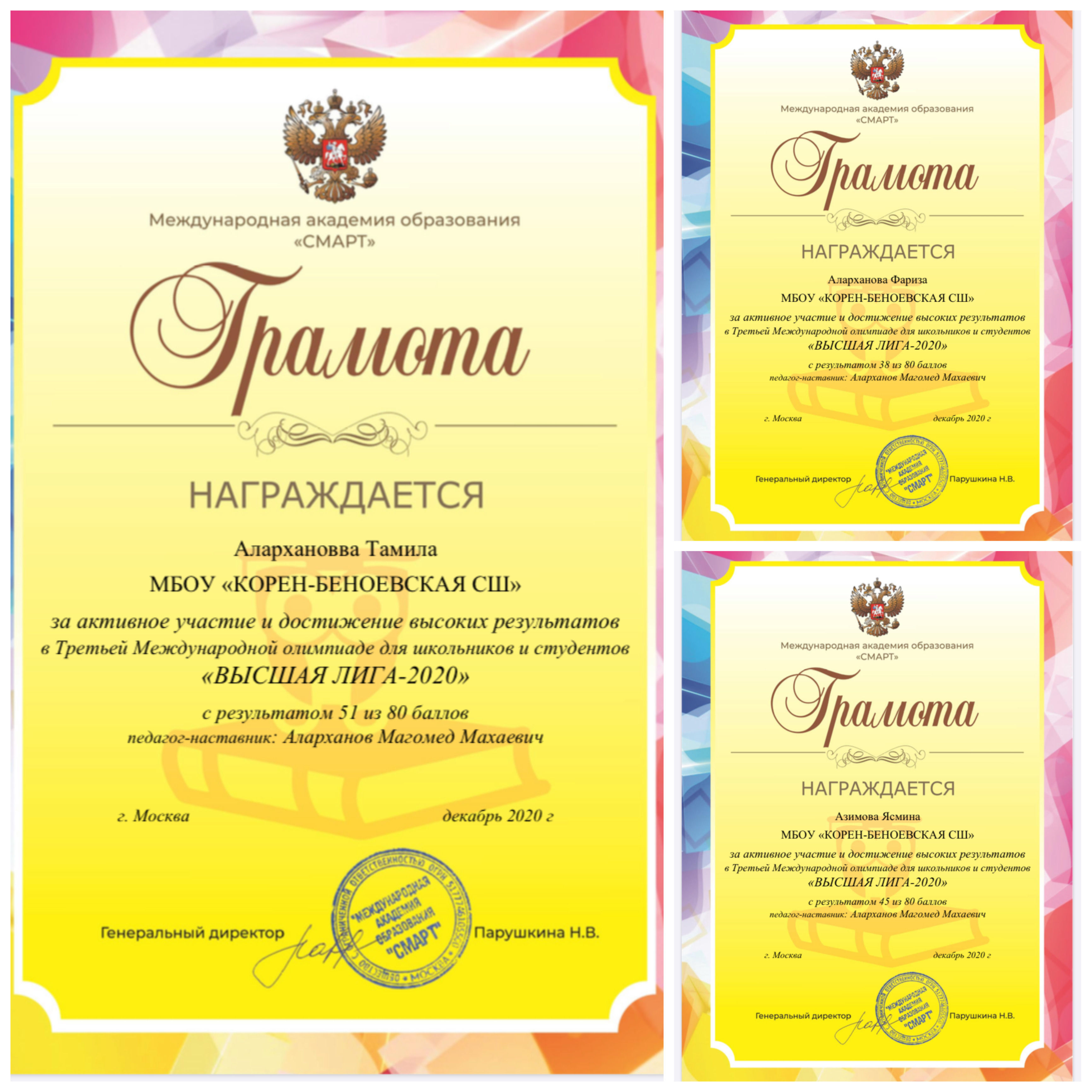 С 14 по 25 декабря 2020 года на сайте «Международная Академия Образования» прошла олимпиада для школьников и студентов «Высшая Лига-2020». В нем приняли участие учащиеся 6, 7 классов. Задания были разного уровня сложности из области русского языка, математики, литературы и биологии. По итогам олимпиады в адрес всех участников были высланы Грамоты «За активное участие и достижение высоких результатов в Третьей Международной олимпиаде для школьников «ВЫСШАЯ ЛИГА-2020». Также, благодарственное письмо директору школы и педагогу, за организацию и проведение профессиональную подготовку участников...