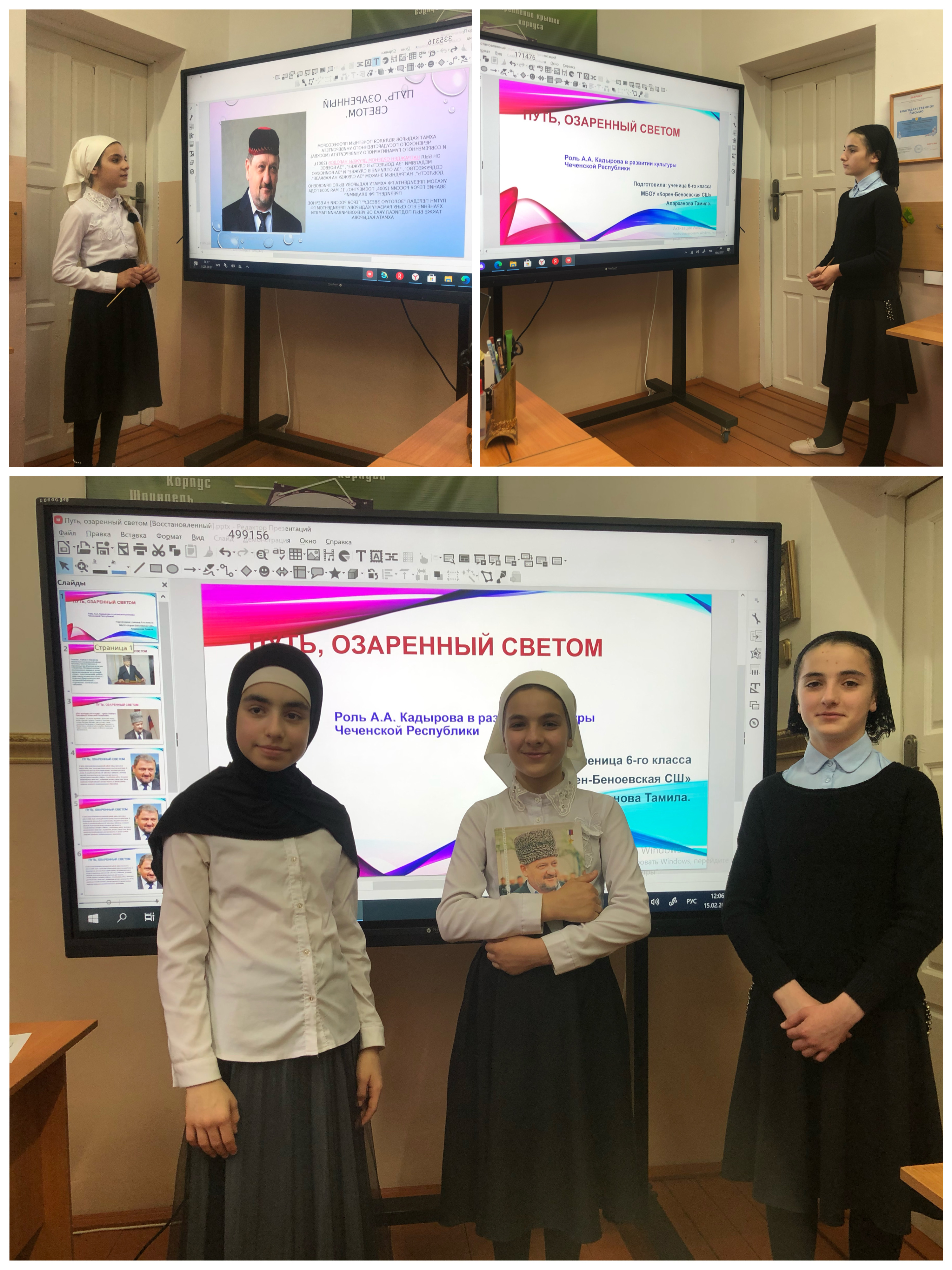 Учащиеся 6 класса подготовили и провели презентацию по учебному пособию ПУТЬ, ОЗАРЕННЫЙ СВЕТОМ. Девочки рассказали о жизни и деятельности Первого Президента Героя России А.А. Кадырова по следующим темам: "Биография а.а. Кадырова", "Роль А.А. Кадырова в развитии культуры Чеченской Республики".