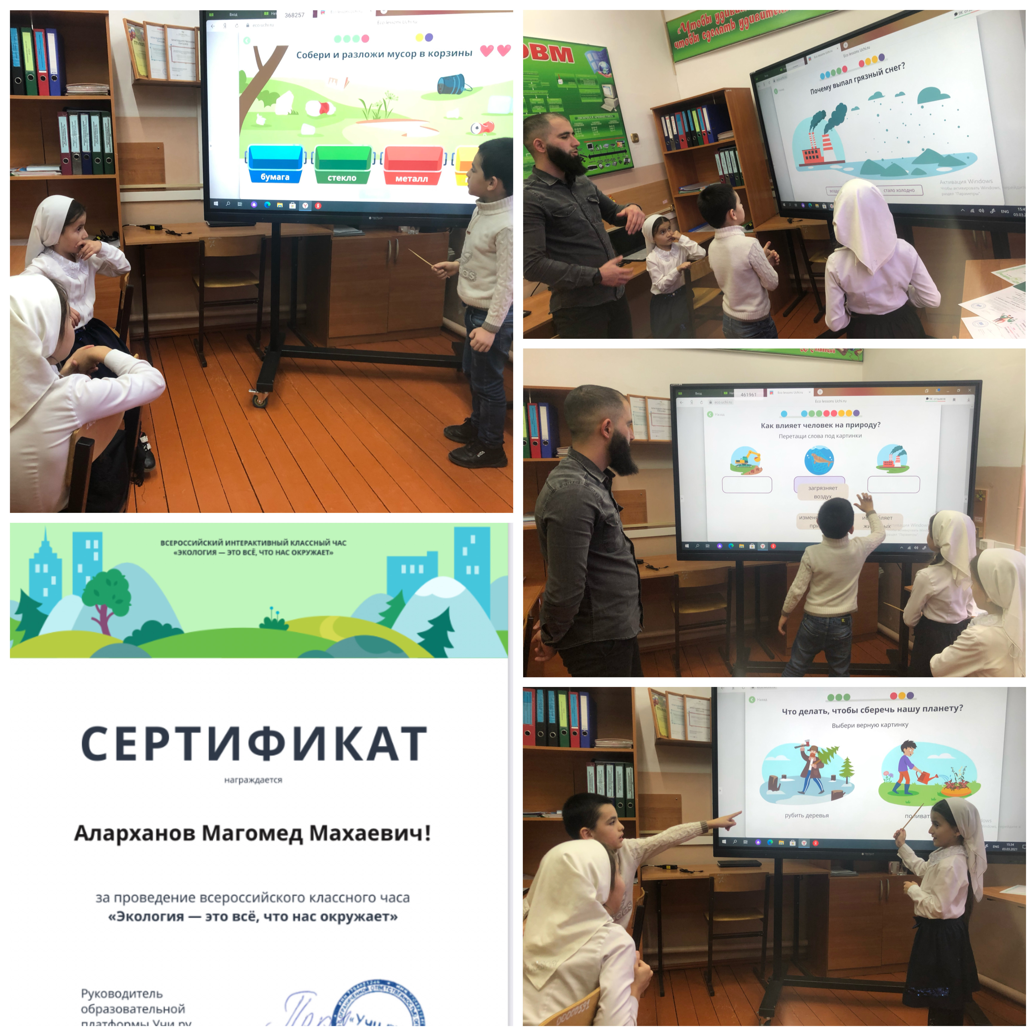 4 марта в 1-м классе учитель начальных классов провел интерактивный классный час на образовательной платформе Учи.ру на тему «Экология - это всё, что нас окружает». Учитель рассказал детям о базовых принципах бережного отношения к окружающей среде. Дети узнали об экологических проблемах и способах их решения.