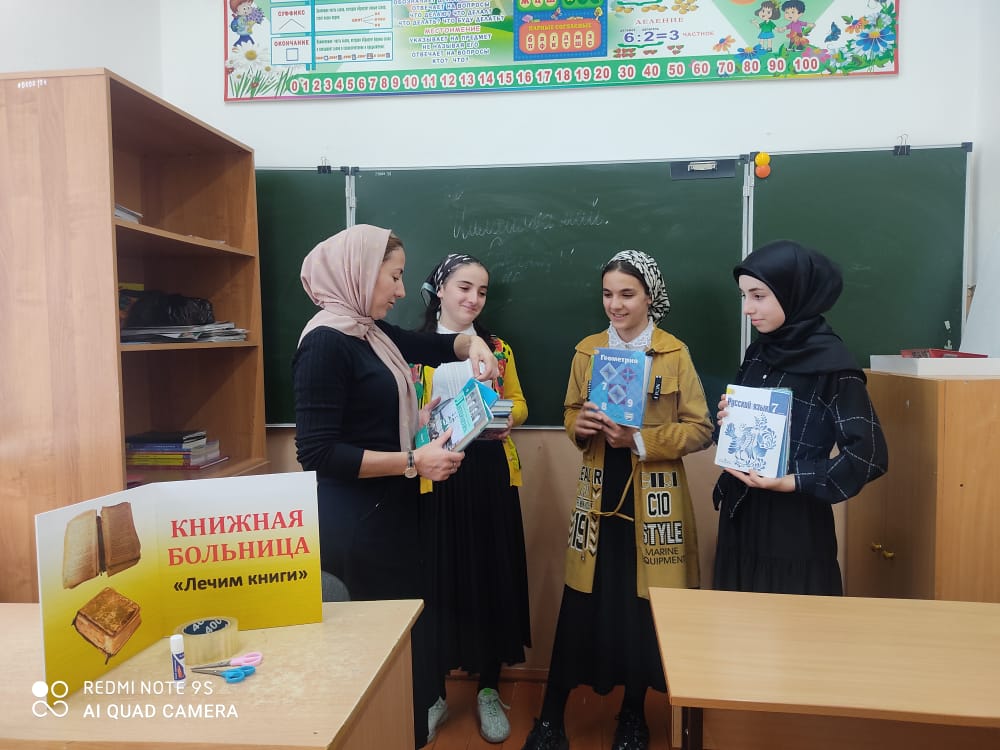 Классный руководитель - Аларханова М.М. провела ознакомительную беседу о роли книги в жизни человека, о необходимости бережного отношения к книге. Далее, вместе с учащимися подошли к столам, где были приготовленные поврежденные книги. Вместе с библиотекарем школы Мочуевой Х. У. рассматривали и лечили поврежденные книги.