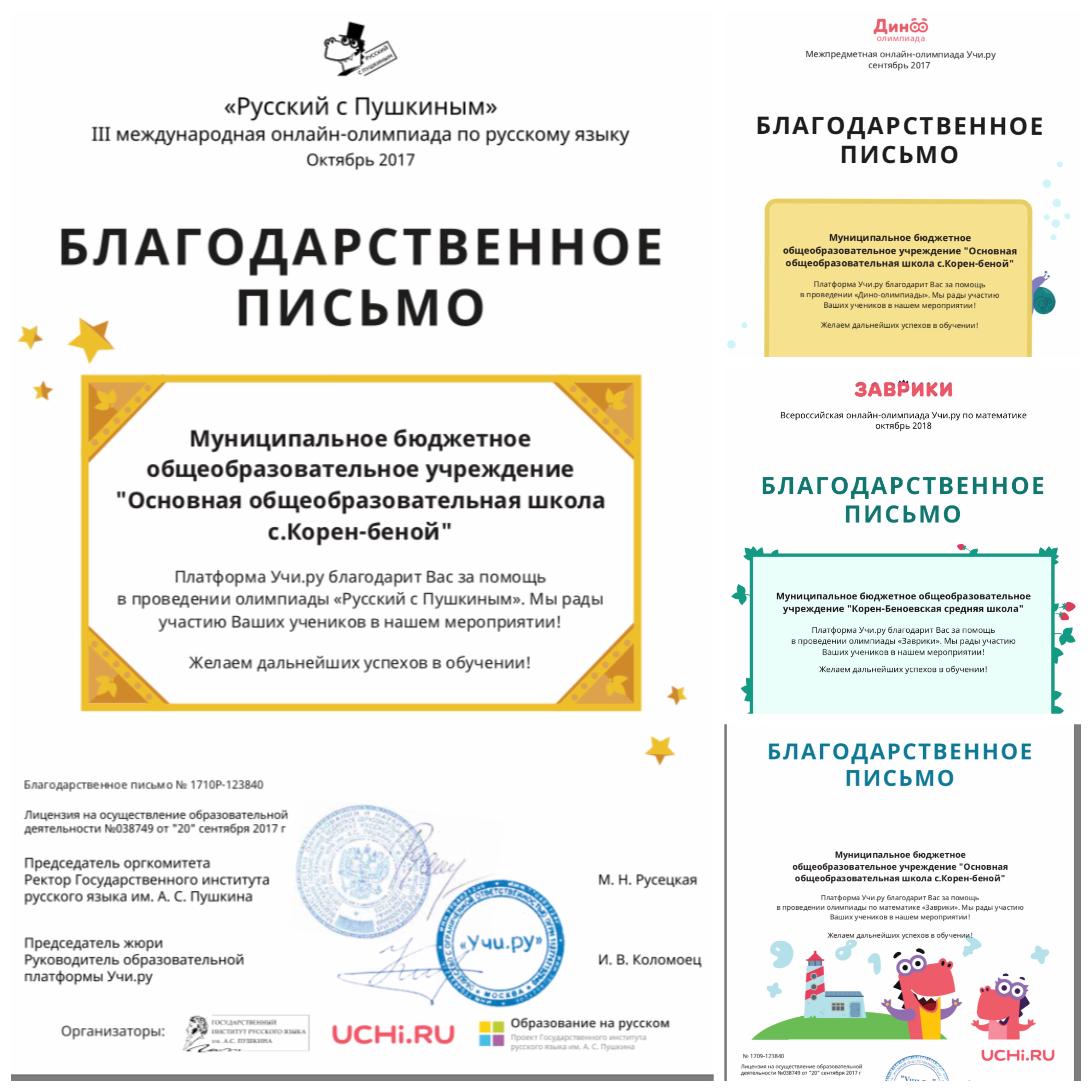 По итогам мониторинга МОиН Чеченской Республики за 2016 год "О работе образовательных организаций региона на данной образовательной платформе". Наша школа была отмечена, как активно работающая с образовательными ресурсами Учи.ру